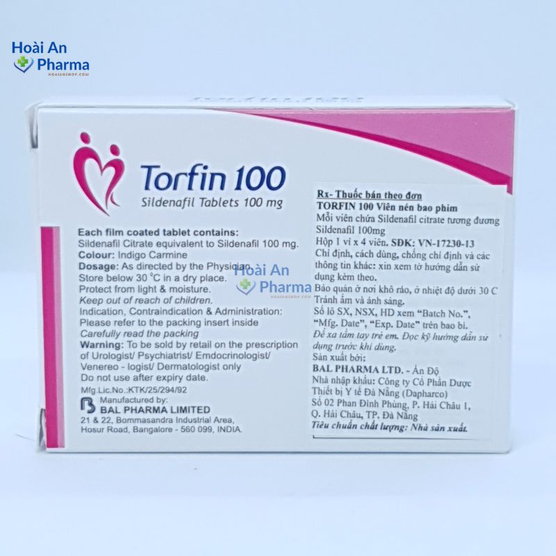 - Torfin 100mg chứa Sildenafil citrate, là hoạt chất đã được chứng minh lâm sàng trong điều trị rối loạn cương dương. Sildenafil giúp tăng lưu lượng máu đến dương vật khi có kích thích tình dục.